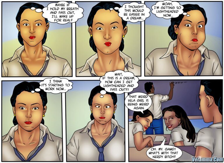 Velamma recollects her time in school when she was bullied in Mr. Rao’s class. The bully Deeba tries to annoy Velamma, which results into both of them getting detention with Mr. Rao. As the story unfolds, Deeba comes up with a plan to cut short the detention if Velamma is willing to do something she has never done before.